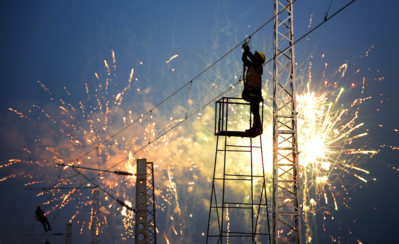 1月7日,中铁七局的铁路建设者在进行铁路线路接触网施工。