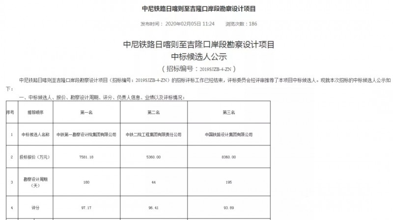 2月5日,中尼铁路日喀则至吉隆口岸段勘察设计项目中标候选人开始公示,中铁一院中标。