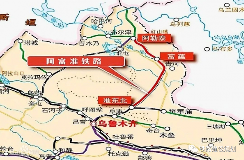 全长420公里的阿富准铁路位于阿勒泰地区及昌吉州境内,线路起自北阿铁路终点阿勒泰市,跨越克兰河、喀腊塑克水库,穿过卡拉麦里山有蹄类野生动物自然保护区,终至准东北站,北端接入乌(北)将(军庙)铁路,于2016年5月21日开工建设。