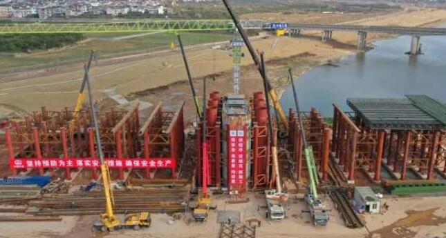 常山江特大桥是杭衢铁路的全线控制性工程,主桥采用三线矮塔斜拉桥,是全线跨度最大、结构最复杂、单体工程量最大的桥梁结构工程,共设97个桥墩、2个桥台,预计2022年5月全桥完成合拢。