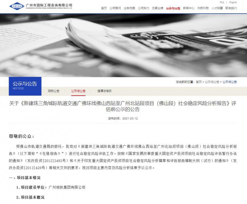 3月12日,《新建珠三角城际轨道交通广佛环线佛山西站至广州北站段项目(佛山段)社会稳定风险分析报告》在广州市国际工程咨询有限公司网站发布。