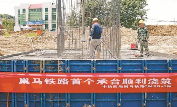 “这是巢马城际铁路全线第一座承台,于7月21日浇筑完成,标志着跨G205特大桥进入主体工程施工,为下一步施工打下了坚实基础。”8月5日,正在现场指挥施工的中铁四局巢马城际铁路CMSG-3标二分部党支部书记王兵告诉记者,目前项目部正努力克服高温酷暑带来的影响,一如既往保持良好的施工态势,在保证安全、质量的前提下,进一步加快施工进度。