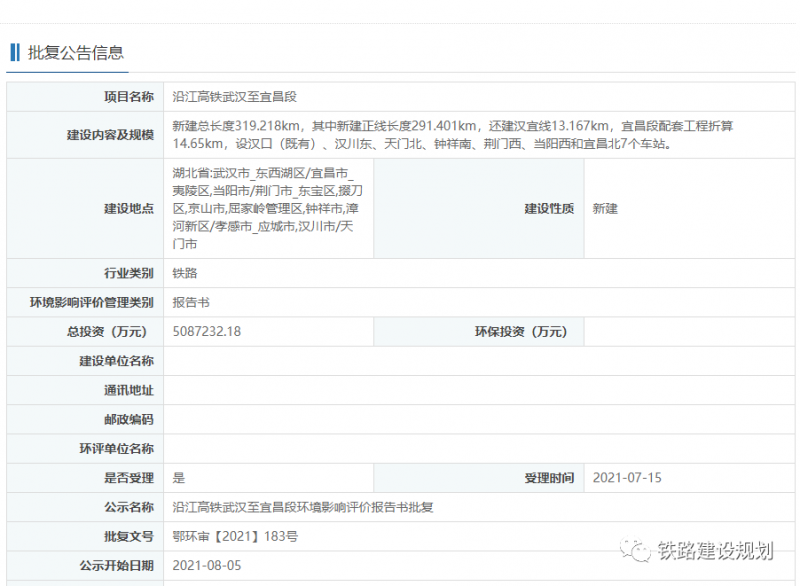 8月5日,湖北省生态环境厅发布了《沿江高铁武汉至宜昌段环境影响评价报告书批复》(鄂环审【2021】183号)公告。项目环评报告批复为初步设计批复的重要前置手续之一,预示着项目离初步设计批复又更进一步。