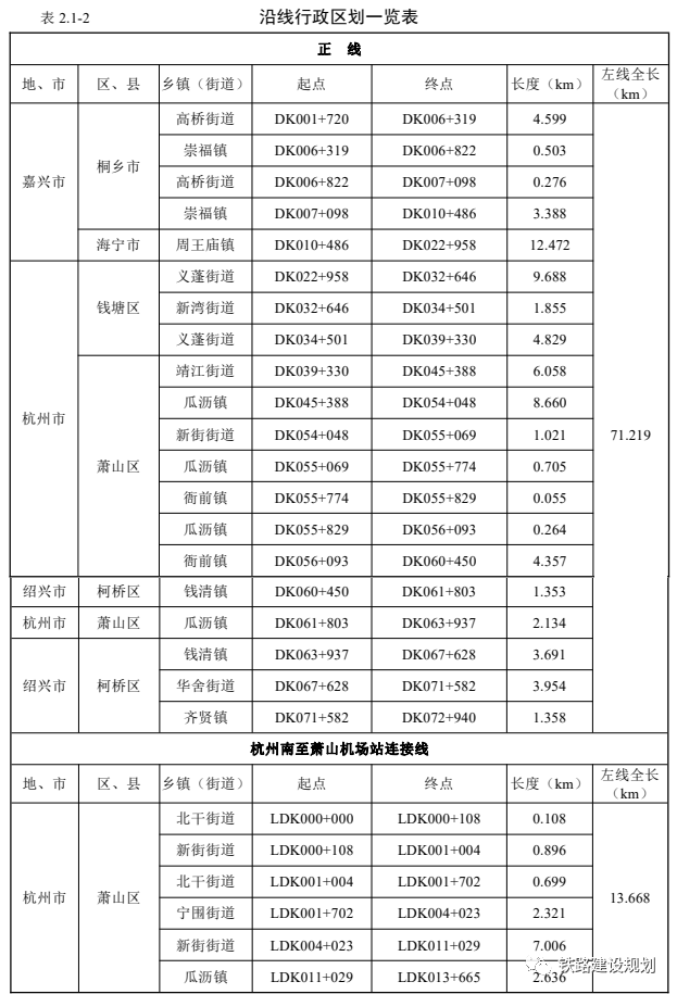 正线新建线路长度71.219km、杭州南站至萧山机场连接线新建线路长度13.668km。设5座车站,其中新建3座分别为海宁观潮站、钱塘站、萧山机场站;改建2座分别为桐乡站(有站房改建工程)、杭州南站(咽喉区引入,无站房工程)。