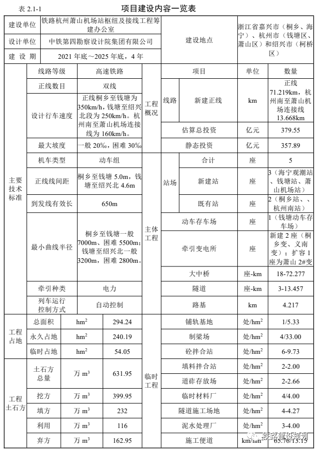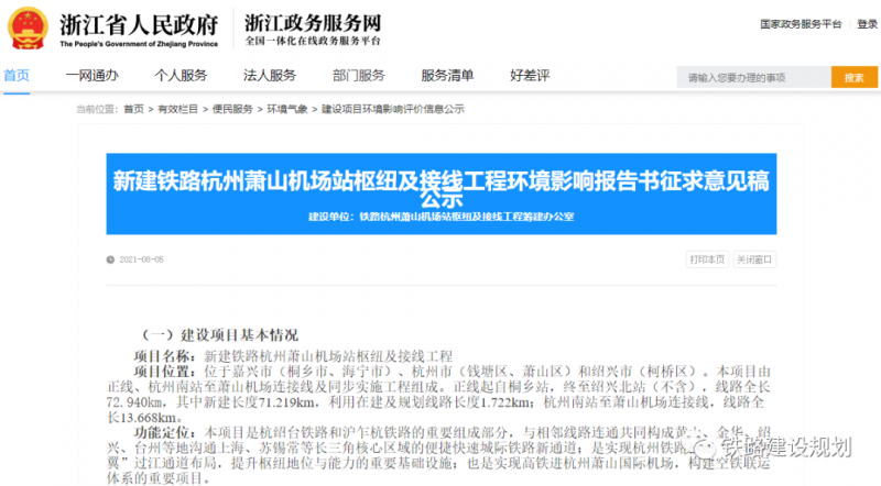 8月5日,《新建铁路杭州萧山机场站枢纽及接线工程环境影响报告书征求意见稿公示》在浙江政务服务网发布。