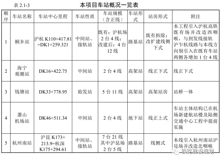 正线分布桐乡站、海宁观潮站、钱塘站、萧山机场站、绍兴北站等5座车站,其中钱塘站为始发终到站,其余均为中间站;桐乡站为沪杭高铁既有站;海宁观潮站、钱塘站和萧山机场站为新建车站;绍兴北站为本项目在杭绍台线正线接入,本次评价不含绍兴北站。