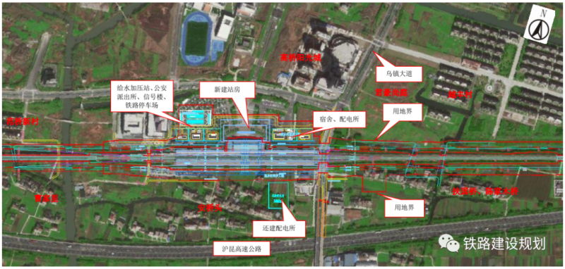 新建桐乡站需拆除还建既有桐乡站站房及北侧生产生活房屋,南侧桐乡配电所也同步拆除还建。新建站房规模为12000m2,设铁路专用停车场面积为5000m2。桐乡站新增工程用地(含钱家线路所同步实施工程)为18.79hm2。