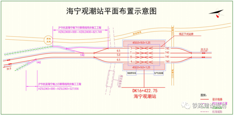 考虑远期本线往杭州西、湖州方向跨线列车开行需求,在本线预留沪乍杭至海宁上、下行方向联络线的条件。