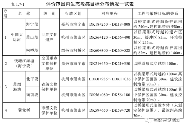 涉及到的环境敏感区主要有:大运河1处世界文化遗产,钱塘江海塘(海宁段)(国家级)、萧绍海塘(省级)、巽龙桥(市级)等3处文物保护单位。