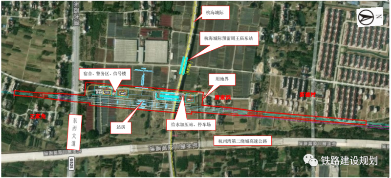 海宁观潮站是新建中间站,为高架车站。车站位于海宁市周王庙镇新建村南侧,车站桐乡端上跨杭海城际铁路,绍兴端上跨国道G525,车站按2台4线(含正线2条)规模布置。站房为线正下式,最高聚集人数为600人,站房面积按6000m2控制,设铁路专用停车场面积为5000m2。杭海城际预留周王庙东站距离海宁观潮站房中心直线距离约250m,满足杭海城际车站与本线换乘需求。选址占地面积为6.94hm2。