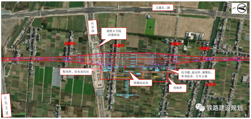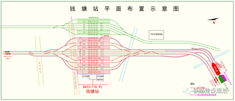 钱塘站东侧预留规划市域铁路(水乡旅游线)引入钱塘站并站设分场条件,预留市域铁路车场按2台6线(含正线)布置。