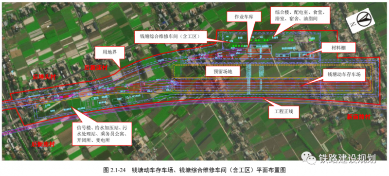 工程新建钱塘动车存车场1处,占地22.3hm2,承担本线始发终到动车组的存放、卸污、洗车任务。选址位于杭州市钱塘区义蓬街道。