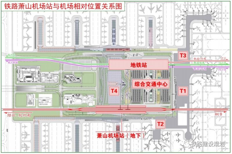 新建铁路萧山机场站位于杭州市萧山区瓜沥镇,位于机场建设总体规划中预留的综合交通中心南侧、T2航站楼之间。车站为地下站,按2台4线方案实施(含正线2条),到发线有效长650m。
