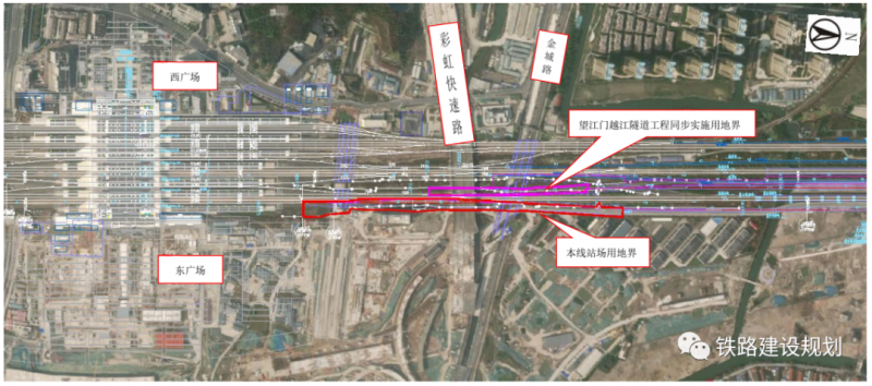 杭州南至萧山机场站连接线在杭州南站北端咽喉引入,下行线(左线LDK)与沪昆场北端安全线接轨。上行线接入时需对沪昆场北端咽喉进行改建,萧山机场站至杭州南连接线上行线(右线)与沪昆高铁在沪昆下行线K172+623.236接轨,设安全线与既有(4)到发线联通行。本工程杭州南站增加用地0.76hm2,主要为既有铁路路内用地。