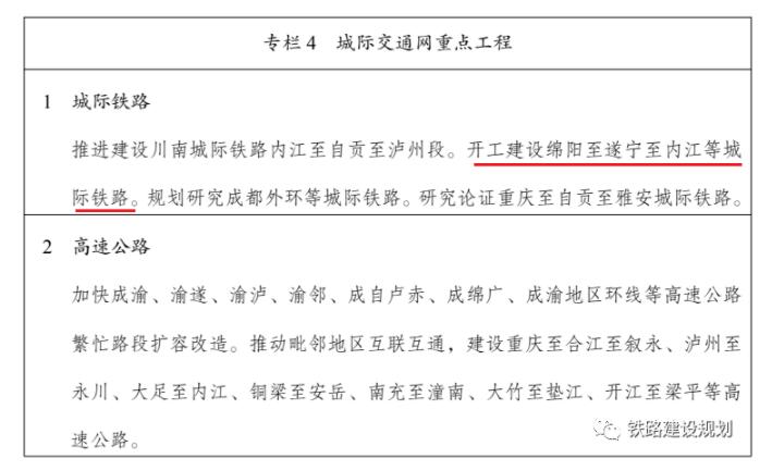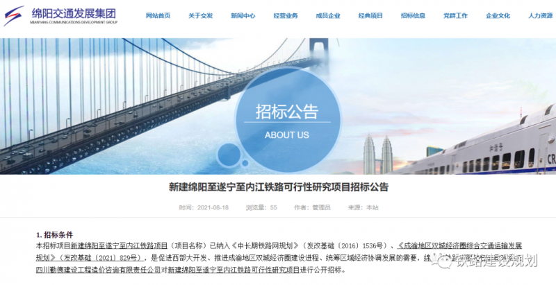 8月18日,绵遂内铁路有限责任公司发布了《新建绵阳至遂宁至内江铁路可行性研究项目招标公告》。项目可研前期工作正式启动,即将进入正式实施阶段,有望在“十四五”初期开工建设。