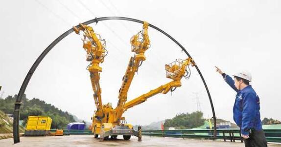图为施工现场,拱架安装台车将拱架直接放进隧道,有效减少了在隧道狭小空间的拼接工序。