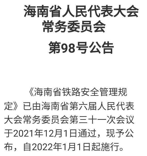 近日,海南省第六届人民代表大会常务委员会第三十一次会议通过《海南省铁路安全管理规定》(以下简称《规定》),自2022年1月1日起施行。《规定》提出,铁路隧道、铁路地下车站结构外沿线外侧起五十米内的区域,应当纳入铁路线路安全保护区范围。