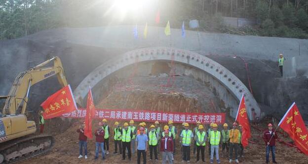 新荣隧道位于玉林市兴业县境内,全长1.56公里,围岩等级复杂,岩体较破碎,节理、裂隙较发育,洞身穿过174米破碎带,地下水丰富,地质复杂,工期紧张,采用无砟轨道。2020年4月27日上午,中铁二局南玉铁路项目新荣隧道顺利开挖进洞,自隧道开工以来,项目部坚持以安全生产为前提,严格遵守软弱围岩“管超前、严注浆、短开挖、强支护、早封闭、勤量测”的十八字诀施工原则组织施工,稳扎稳打,确保施工安全、质量,历时440余天,最终实现整条隧洞快速、高效、零事故安全顺利贯通,为决胜总体目标更进一步。