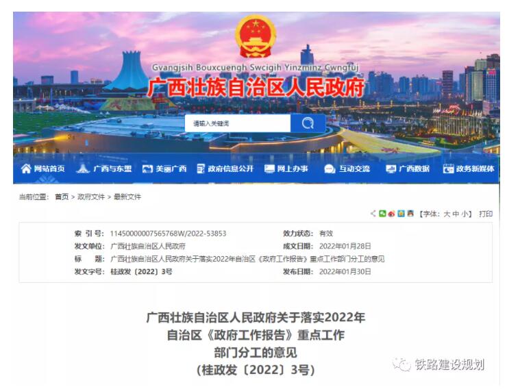 近期,《广西壮族自治区人民政府关于落实2022年自治区〈政府工作报告〉重点工作部门分工的意见》出台,《意见》就2022年自治区《政府工作报告》确定的重点工作,提出部门分工意见如下(仅节选重大项目建设方面内容)。