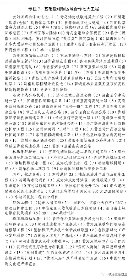 沿黄达海高铁大通道:(1)京雄商高铁山东段;(2)京沪高铁辅助通道潍坊至新沂段;(3)济郑高铁山东段;(4)鲁南高铁菏泽至兰考段;(5)济南至莱芜高铁;(6)潍坊至烟台铁路;(7)莱西至荣成铁路;(8)济南至滨州铁路;(9)德州至商河铁路;(10)滨州(东营)至淄博至莱芜至临沂铁路;(11)青岛至京沪高铁辅助通道铁路;(12)长治至邯郸至聊城铁路;(13)济南铁路枢纽升级改造;(14)聊城至泰安至莱芜至京沪高铁辅助通道铁路;(15)青岛至日照高铁。