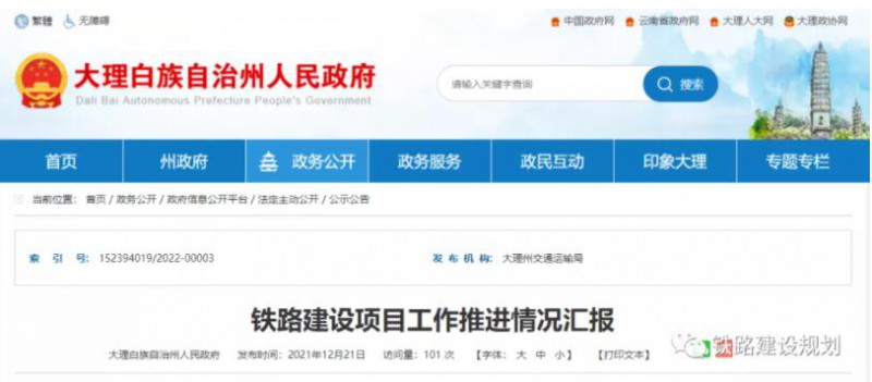 去年12月21日,大理州交通运输局发布了《铁路建设项目工作推进情况汇报》,详情如下: