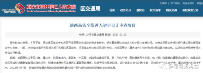 据悉,渝西高铁位于四川省、重庆市、陕西省境内,是国家“十三五”铁路规划建设项目,是“八纵八横”高铁通道网中京昆、包(银)海通道的重要组成部分,也是成渝地区双城经济圈联接丝绸之路经济带、联通京津冀协同发展区的重要高铁通道。
