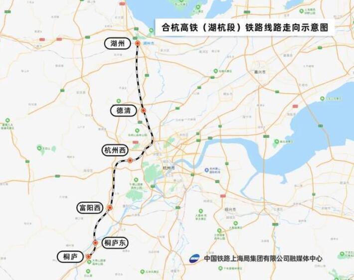 合杭高铁湖杭段从既有宁杭高铁湖州站引出,经湖州市南太湖新区、吴兴区、德清县,杭州市余杭区、西湖区、富阳区和桐庐县,跨富春江后引入杭黄高铁桐庐站,新建线路长约137.8公里,设计时速350公里。全线设车站6座,其中利用既有车站2座(湖州站、桐庐站),改建既有车站1座(德清站)、新建车站3座(杭州西站、富阳西站、桐庐东站)。