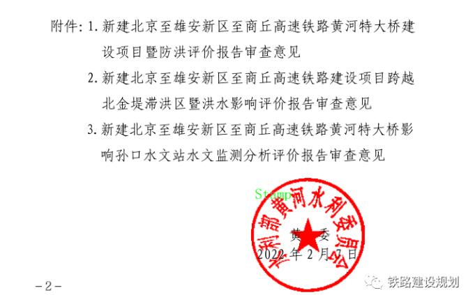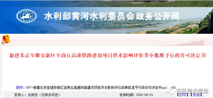2月21日,水利部黄河水利委员会发布了《新建北京至雄安新区至商丘高速铁路建设项目洪水影响评价类审批准予行政许可决定书》,项目跨黄河洪水影响评价报告正式获批,年内有望正式开工建设。