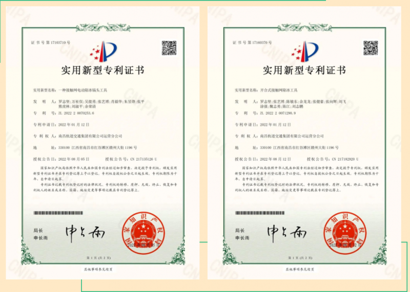 近日,运营分公司维修中心供电二车间接触网专业团队研发的“一种接触网电动除冰镐头工具”和“开合式接触网除冰工器具”获得国家实用新型专利授权(专利号ZL 2022 2 0070253.6、专利号ZL 2022 2 007129.9)。