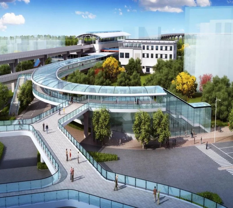 武汉新荣轨道交通换乘工程连接武汉轨道交通1号线新荣站和阳逻线一期工程新荣客运站两座站点,项目北接阳逻线新荣客运站B出入口,沿后湖大道出地面后,与市政过街天桥合建沿解放大道人行道上方布设至1号线新荣站,并于1号线新荣站端头新建换乘厅,与换乘天桥相接,实现阳逻线新荣客运站与1号线新荣站付费区换乘。