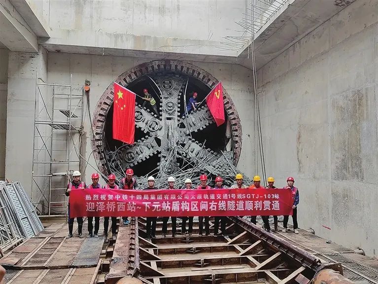 8月24日,中铁十四局集团有限公司承建的地铁1号线103标段有新突破。当天,“奋晋2号”盾构机在迎泽西大街迎泽桥西站——下元站区间右线“出洞”;不远处,“奋晋1号”盾构机在大南门站——桃园路站区间的左线“进洞”。在汾河两岸的迎泽大街上,两台盾构机几乎“前后脚进出”,反映出太原地铁1号线紧抓施工黄金期,正在“快马加鞭”推进中。