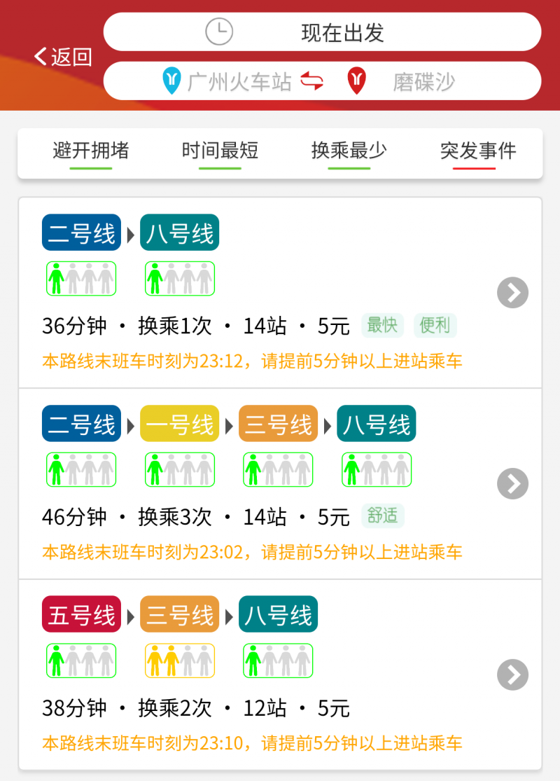 为进一步提高乘客出行体验,近日,广州地铁官方APP上线试运行“精准出行”功能,该功能主要通过大数据推测出行时段地铁客流状态,帮助用户规避拥堵和受突发事件影响路段,推荐用时短、换乘便捷的最优路径。