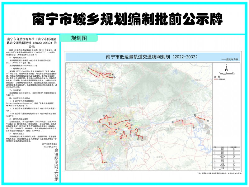 根据《中华人民共和国城乡规划法》第二十六条规定,对《南宁市低运量轨道交通线网规划(2022-2032)》主要内容进行公示,现将有关事宜公示如下: