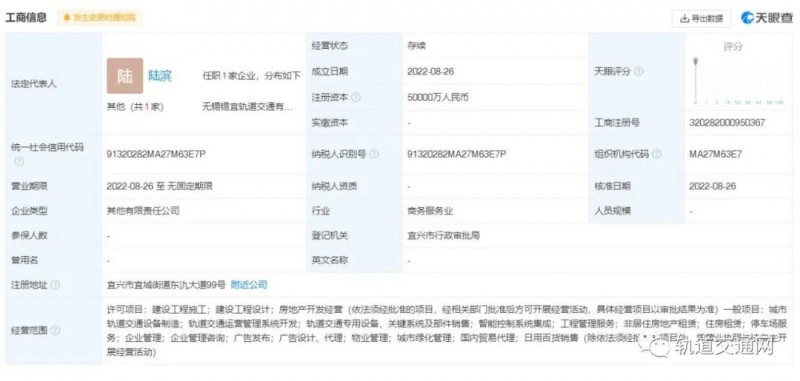 8月26号,无锡锡宜轨道交通有限公司注册成立,注册资本50000万人民币。该公司由无锡地铁集团有限公司(占股50%)和宜兴市交通能源集团有限公司(占股50%)共同持股。