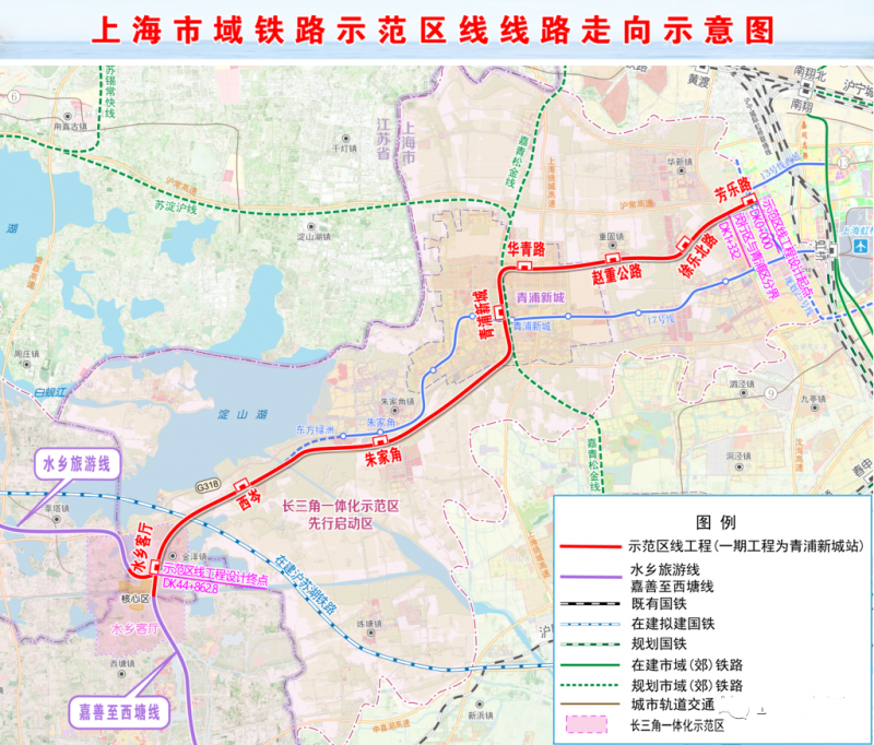 ▼市域铁路示范区线(暂名)(芳乐路站~省界区段)线路总体方案走向示意图(以施工图和实际建设为准)(本次工程不含青浦新城站、暂不含车辆基地及出入线、暂不含延伸区段、暂不含苏淀沪线接线站)(车站名称均为暂名)