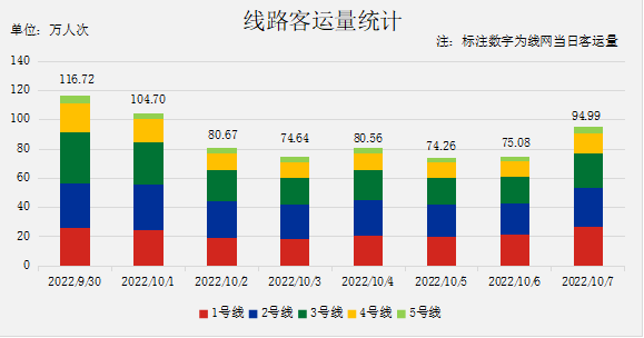 国庆假期,2号线累计运送乘客最多,达202.9939人次,其余线路运送乘客如下:1号线177.6592万人次,3号线185.2945万人次,4号线104.1668万人次,5号线南段31.5138万人次。