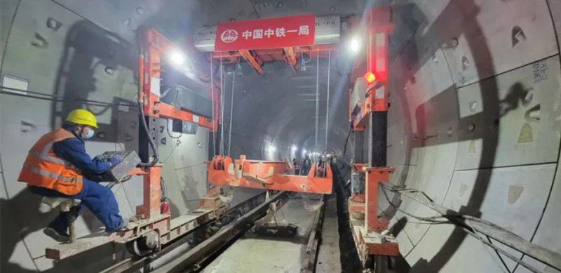自去年9月30日开铺以来,轨道工程一标项目部在全线设置了3个铺轨基地,投入新能源铺轨机24台、新能源轨道车6台、平板车12台、门式起重机8台,高峰时共有530余人参与施工生产。在确保安全的前提下,高峰时期创造了单日道床浇筑429.1米、道床铺设521米的“一局速度”。
