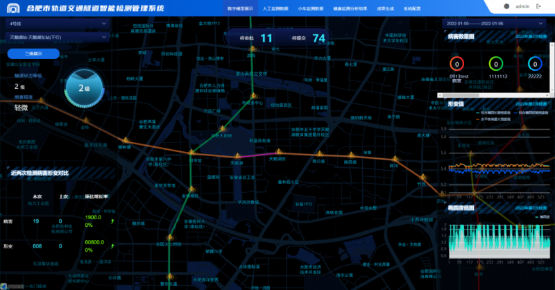 该系统利用软硬件结合的方法,在已运营的区间隧道内放置自动巡检机器人,对轨道、隧道结构和管片进行全方面检测并采集数据,将数据实时关联共享,快速获取隧道三维空间与表面缺陷图像数据。再通过数字孪生技术,实现隧道健康状态快速分析与监控,确保隧道安全运营。相较于传统的人工巡检,该系统大幅提升了隧道形变检测的范围和精度、提高了巡检效率,降低了巡检成本,实现基础设施的运维数字化和智能化,实现数据可视化管理与共享。