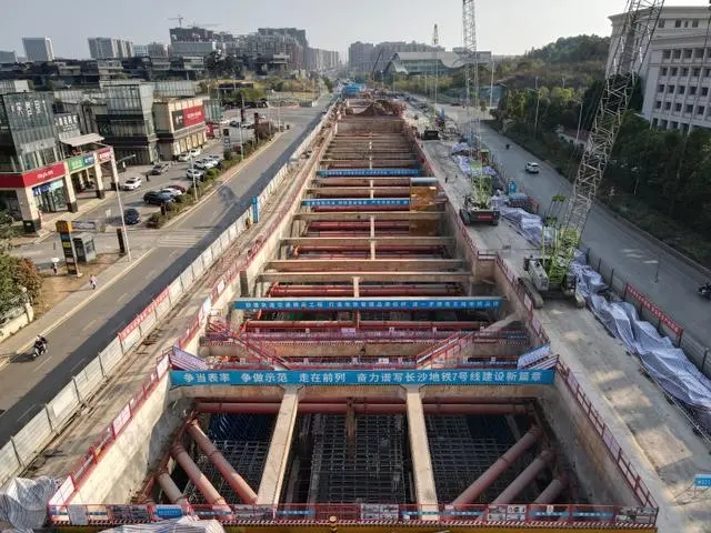 截至目前,长沙地铁7号线全线16座车站已有3座车站进行主体结构施工,3座车站进行土方开挖施工,9座车站开展车站主体围护结构施工,1座车站进行交通疏解及管线迁改施工。