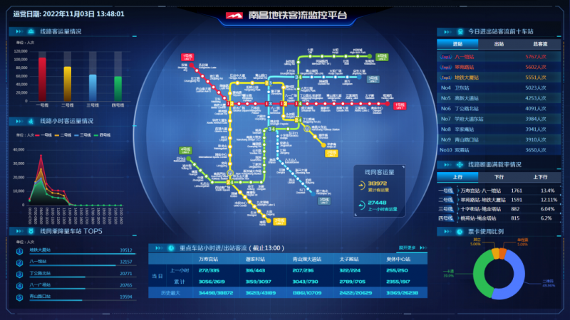 通过与清分中心制定的数据接口协议,实现了生产数据以低颗粒度精准实时推送、解析。通过数据图形化展示,突出关注重点及大客流趋势,方便了OCC调度人员对线网客流情况的及时掌控,同时在OCC现场行车管理、客运组织及车辆调度等方面起到了非常重要的作用。