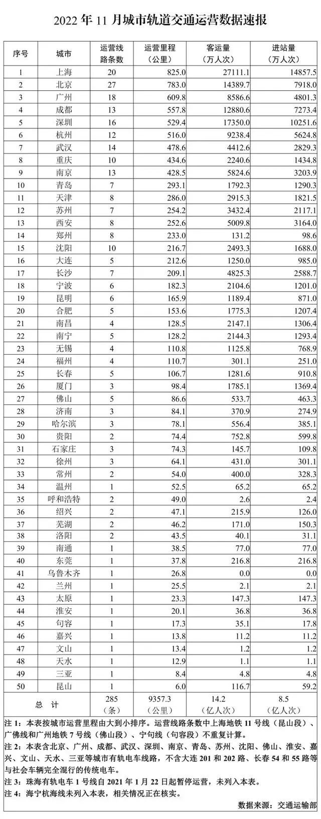 以下为交通运输部公布的2022年11月城市轨道交通运营数据速报: