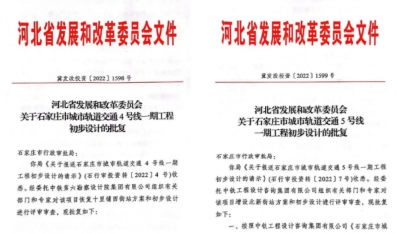 12月23日,石家庄市轨道交通4、5号线一期工程初步设计分别获河北省发改委批复,意味着石家庄市轨道交通二期规划建设取得又一里程碑式进展。4号线一期工程起自玉村南路站,终到东垣东路站。线路全长约22.43公里,设站20座,其中换乘站6座,平均站间距约1.16公里。5号线一期工程起自宫北路站,终至谈固北大街站。线路全长约19.9公里,设站19座,其中换乘站6座,平均站间距约1.07公里。两条线路的开工建设指日可待。