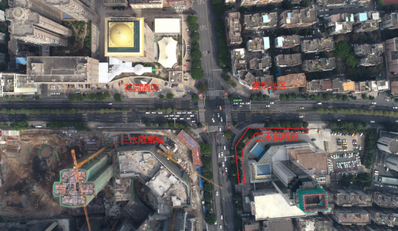 西南街道站地处三水区西南街道广海大道中与健力宝路交汇处,该站点周边地上不仅商场、写字楼林立,居民楼密布,地下市政管网更是错综复杂,涉及供水、雨污水、电力、通信、燃气、交通信号电缆管道等,而车流量、人流量更是西南街道之最,是三水中心城区最繁华的路段。而交通导改实施的前置条件,正是需要先将主体上方错综复杂的管线永迁或临迁至交通疏解道或人行道下方,再在原机动车道的基础上往外拓宽,实现最终的交通导改。也正是这样的繁华路段,给西南街道站一期交通导改制造了不少阻碍。