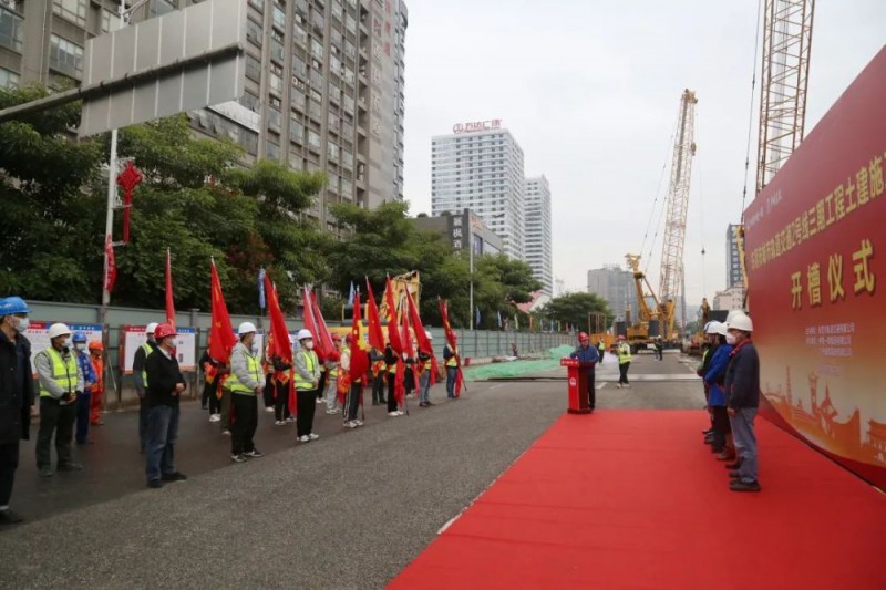 轨道公司、设计、监理、施工单位等单位代表50余人参加了虎门北站连续墙开槽仪式。在仪式上,2331标青年突击队,工人先锋号,党员先锋队进行了授旗和宣誓。