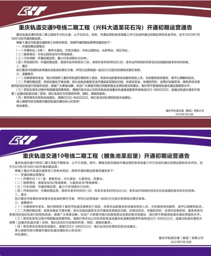 1月18日14时,由重庆轨道集团建设的地铁9号线二期、10号线二期鲤鱼池至后堡段开通初期运营,在广大市民的殷切期盼中正式开门迎客。