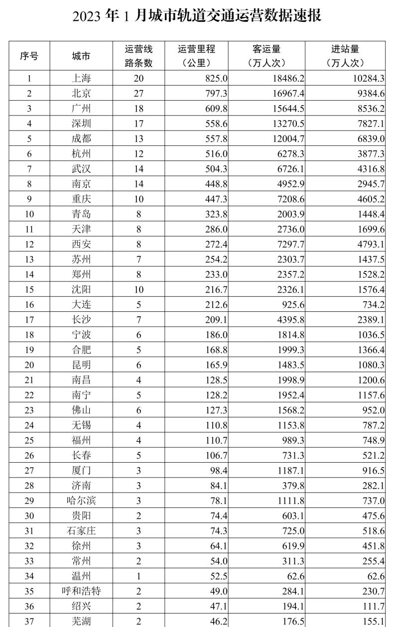2023年1月,31个省(自治区、直辖市)和新疆生产建设兵团共有54个城市开通运营城市轨道交通线路291条,运营里程9609.9公里,实际开行列车296万列次,完成客运量14.7亿人次,进站量8.9亿人次。1月份,客运量环比增加3.1亿人次、增长27.0%,同比减少3.2亿人次、降低17.9%。