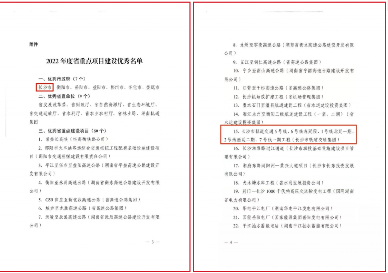 项目为王,实干为要。长沙轨道作为市属国企主力军,在推进实施省重点项目建设中始终奋勇争先、主动作为,发挥国企先锋带头作用,全力推进项目建设,所属项目长沙市轨道交通6号线、6号线东延段、1号线北延一期、2号线西延二期、7号线一期工程(云塘站-五里牌站)荣登优秀省重点建设项目名单。
