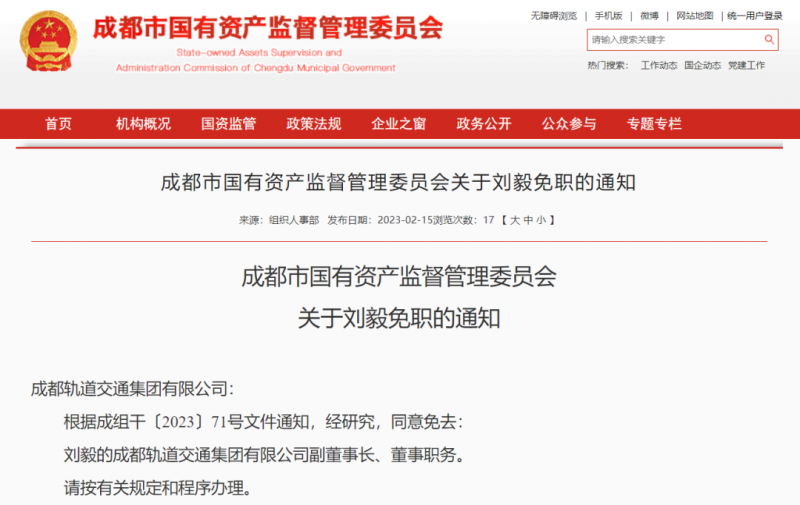 日前,成都市国有资产监督管理委员会发布关于刘毅免职的通知。
