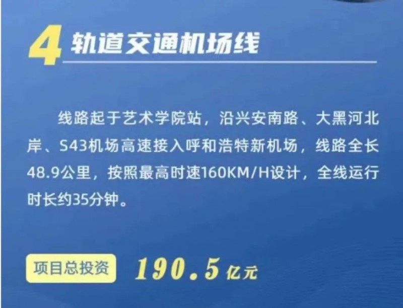日前,呼市发展改革委发布的2023年十大重大项目显示,呼市轨道交通机场线的线路走向已经确定,项目总投资190.5亿元。