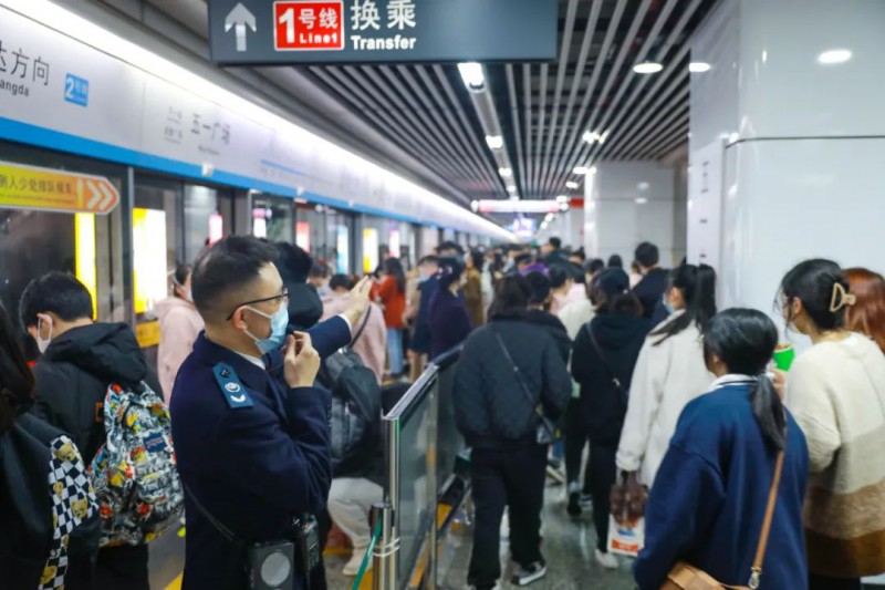 在人头攒动的五一广场站及橘子洲站,车站大量增派支援人员,通过增加安检通道、常开闸机、改变扶梯运行方向,以及根据不同时段客流特点改变闸机方向等,在客流高峰期提高乘客进、出站效率。此外,橘子洲站还通过加强与景区联防联控,增加车站广播引导与告,根据站台、站厅客流情况及时进行客流控制等措施,确保客运组织安全有序。